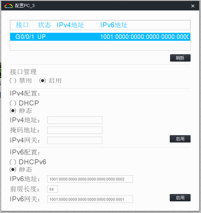 组网图如下图所示。PC3的接口已经启用,从控制端口可以看到。但为什么ping1001::2(自己的IP)也ping不通呢?