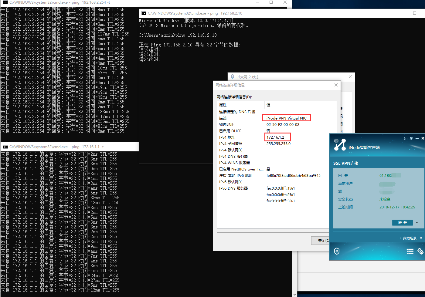 连上iNode之后,能ping通172.16.1.1和192.168.2.254