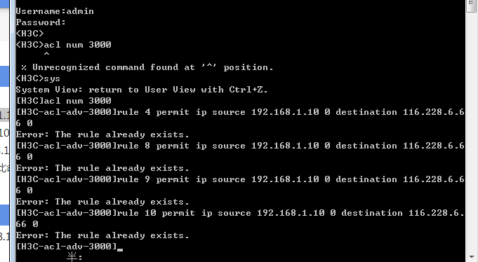 * Copyright (c) 2004-2015 Hangzhou H3C Tech. Co., Ltd. All rights reserved. * * Without the owner's prior written consent, * * no decompiling or reverse-engineering shall be allowed. * ****************************************************************************** Login authentication Username:admin Password: <H3C>sys System View: return to User View with Ctrl+Z. [H3C] [H3C]dis acl 3000 Advanced ACL 3000, named -none-, 1 rule, ACL's step is 5 rule 0 permit ip source 192.168.1.0 0.0.0.255 destination 192.168.2.0 0.0.0.255