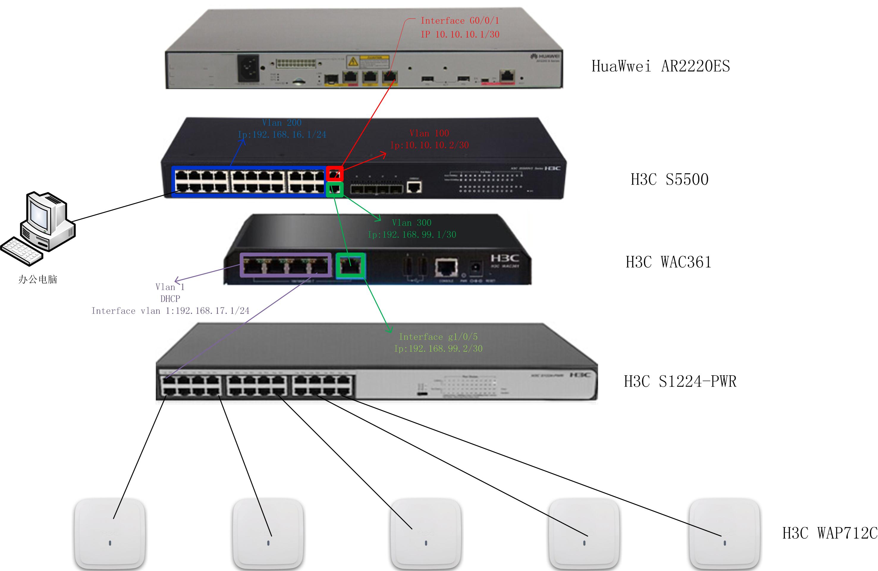 1、将S1224-PWR上行链路由WAC361上拆出移至S5500三层交换机上。