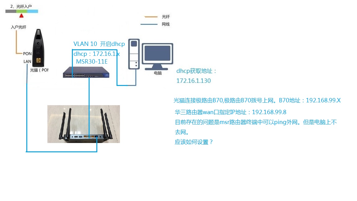 目前一级路由是极路由B70,已经拨号正常上网了。一般用于无线,但是考虑到稳定性和一些网络限制,用MSR30-11E作为二级路由器,管理电脑客户端,但是华三路由器设置后上不去网,不知道如何下手,麻烦高手详细指导一下如何设置,图上有详细的说明。在超级终端中可以正常ping外网地址,但是电脑通过dhcp获取地址后,不能上网,也ping不通极路由 。不知道怎么设置了。麻烦高手详细一步步的指导一下。