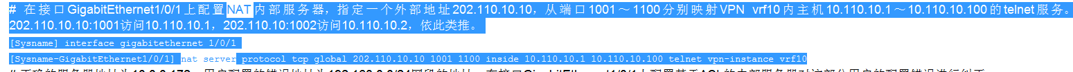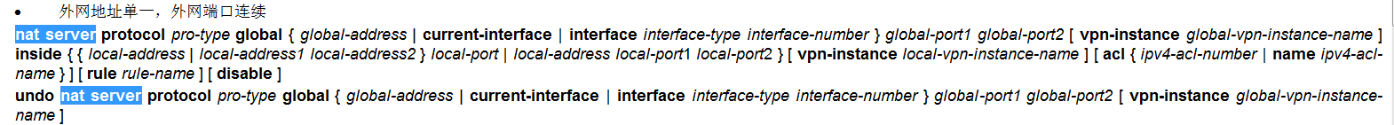 [H3C-GigabitEthernet1/0/2]nat server protocol tcp global 1.1.1.1 1500 1900 inside 2.2.2.2 1500 1900