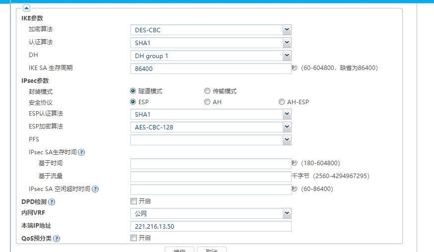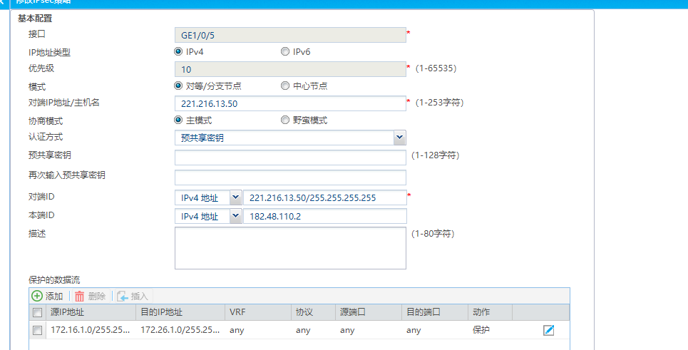 [sjs_firewall]ping 172.16.1.1 Ping 172.16.1.1 (172.16.1.1): 56 data bytes, press CTRL_C to break --- Ping statistics for 172.16.1.1 --- 1 packet(s) transmitted, 0 packet(s) received, 100.0% packet loss [sjs_firewall]dis ike sa Connection-ID Remote Flag DOI ------------------------------------------------------------------ [sjs_firewall]dis ips [sjs_firewall]dis ipsec sa [sjs_firewall]