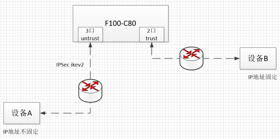 连接方式 : 设备A连接F100-C80,F100-C80连接设备B,设备A通过ipsec 连接到F100-C80,设备A的IP地址不固定。参考了《轻轻松松配置安全(v7防火墙)v1.4》,也从网上搜了一些配置,但针对ikev2都是peer-to-peer的配置,有没有F100-C80做为中心节点ikv2的配置呢?在ikev2 keychain 命令中,只有peer的配置,没有pre-shared-key, 如果配置pre-shared-key,必须要在peer下才能配置。ikev2必须要是对等节点吗?