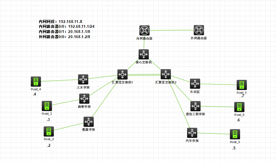 先配置接口地址吧,建议汇聚做irf,内网路由器写一条缺省路由0.0.0.0 0指向外网路由器,外网路由器写明细的192.168.11.0 24的路由指向内网路由器地址