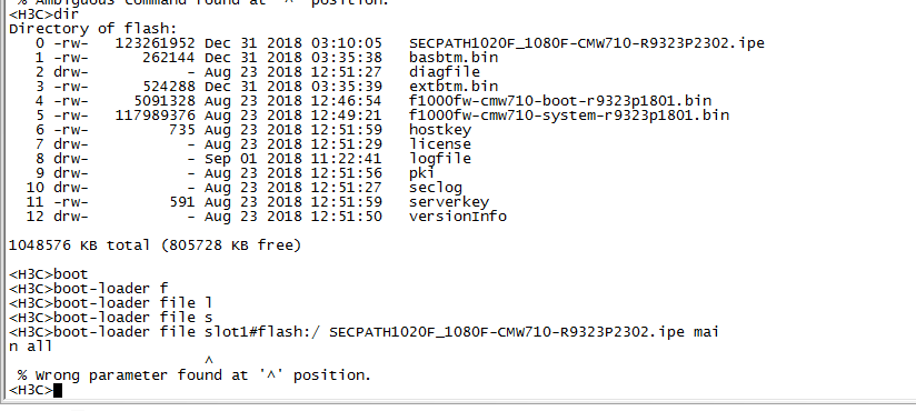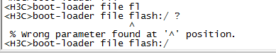 <H3C>boot-loader file flash:/ ? ^ % Wrong parameter found at '^' position. <H3C>boot-loader file flash:/ 打问号就直接在这里出现错误了
