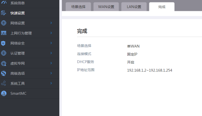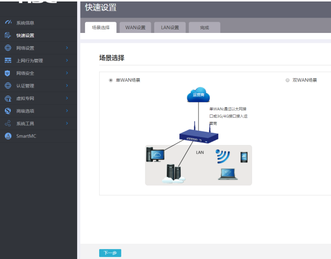 # 登陆WEB管理页面(默认情况下,登陆地址为192.168.0.1/23,登陆用户名为admin,登陆密码为admin),在导航栏选择“快速设置”,进入“场景选择”页面,选择“单WAN场景”, 点击“下一步”按钮。