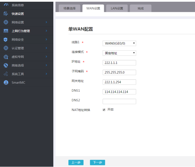 #WAN设置中线路1选择“WAN0(GE0/0)”,连接模式选择“固定地址”按实际需求设置IP地址,网关地址,DNS地址,NAT地址转换保持默认的“开启“状态。然后点击“下一步”按钮