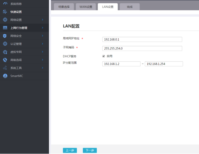 #进入“LAN设置”根据实际需求设置内网网段和DHCP地址分配范围,然后点击“下一步”按钮