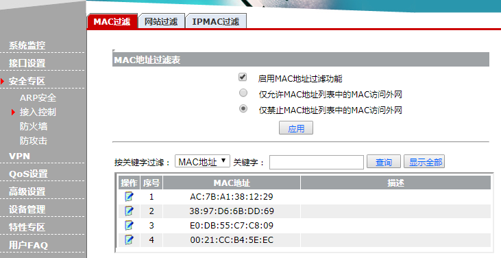 登录进路由器,安全专区----接入控制---MAC 过滤中,点新增,把流量大的那个mac地址禁掉,就像这样: