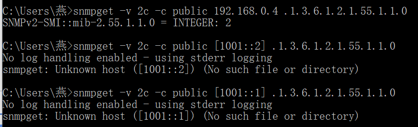 但发现即使读取本地电脑的,也只支持IPv4的,不支持IPv6的,如下图所示,本地电脑的IPv6地址是1001::2,IPv4地址是192.168.0.4,MSR2600路由器的IPv6地址是1001::1(路由器没有配置IPv4地址)。结果发现读取本地的192.168.0.4可以,读取本地的1001::2和路由器的1001::1都不行。其中,.1.3.6.1.2.1.55.1.1.0是ipv6Forwarding。