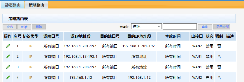 同时也做了策略路由,服务器通过WAN2专线上网,其他电脑通过WAN1上网,策略配置如下: