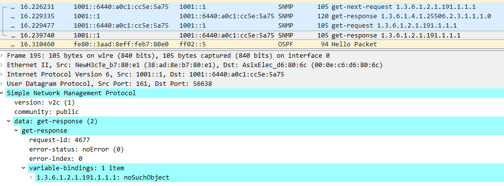 获取的是OSPFV3-MIB::ospfv3RouterId .1.3.6.1.2.1.191.1.1.1,回复见下截图,路由器IP地址是1001::1