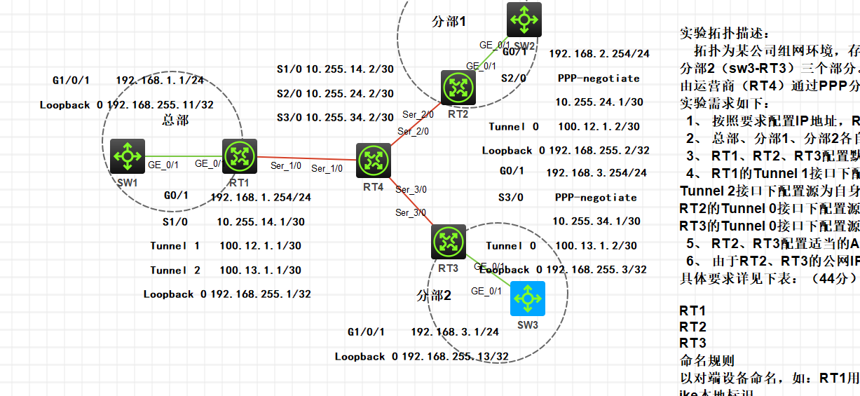拓扑为某公司组网环境,存在总部(sw1-RT1)、分部1(sw2-RT2)、 分部2(sw3-RT3)三个部分。其中总部IP地址固定,分部1、分部2的IP地址不固定, 由运营商(RT4)通过PPP分配。为了保护所有的总部——分部通信,要求采用GRE over IPSec。