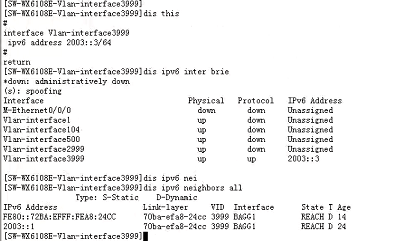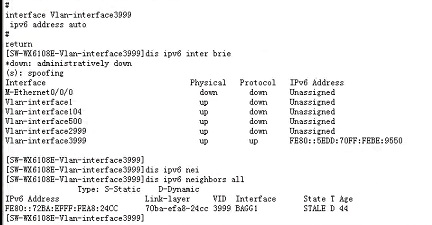 下图是交换机机框interface vlan接口下配置ipv6 address auto后,vlan接口并未获取到正确的ipv6地址,查看ipv6邻居出现了一个不相干的邻居