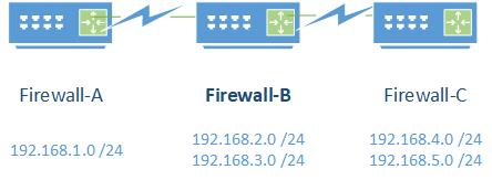 FirewallA 和FirewallB之间建立IPSec VPN。FirewallB与Firewall C之间也建立了IPsec VPN。但是A与C之间没有建立IPsec VPN。