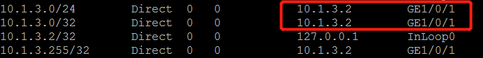 查看FW2的路由表,发现10.1.3.0/24的下一跳地址为FW2的GE1/0/1的地址10.1.3.2