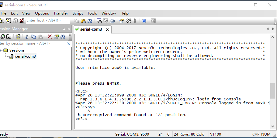 用console线连接了电脑,用SecureCRT软件连接上了,但是输入命令都会提示 % Unrecognized command found at '^' position.