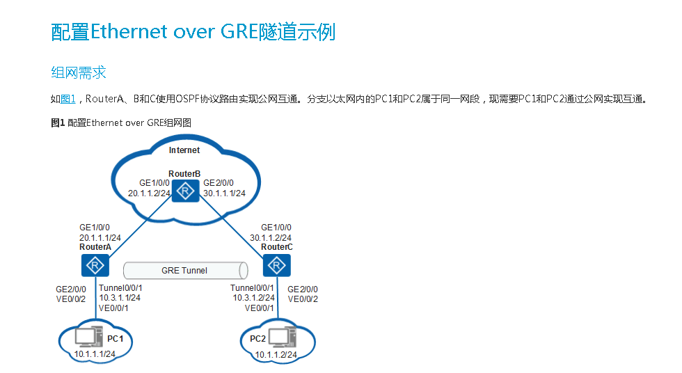 终端在同一网段,就直接配置同一网段的地址就可以了,和GRE没有关系。 这个图里面,两边路由器0/0/2是对接终端的,0/0/1是用来对接GRE隧道的。没有什么实现关系。