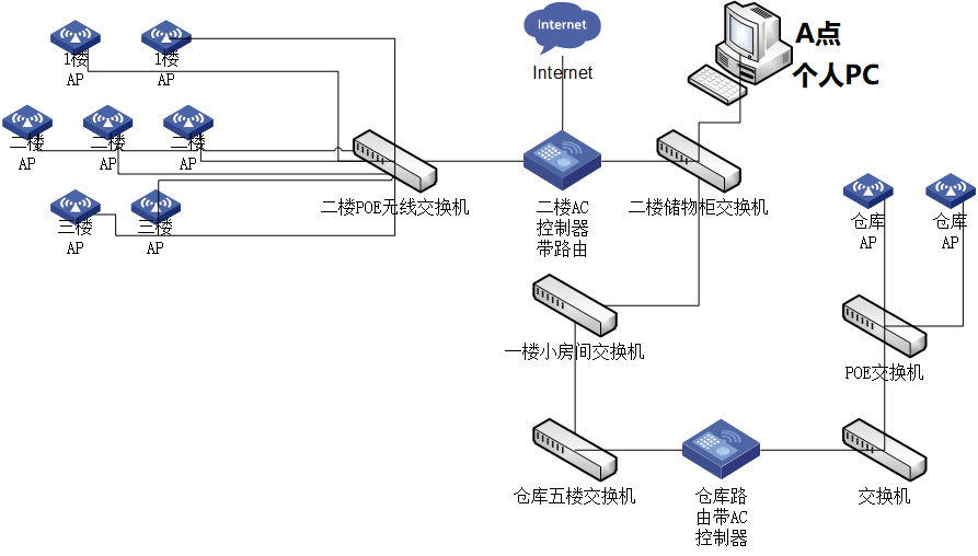 这样组网,A点的PC电脑,如何访问仓库带AC控制器的管理页面以及独立的AP页面
