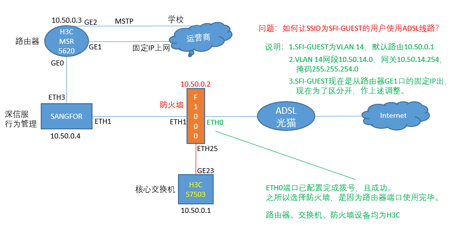简单说就是希望优化下现有网络,让访客走ADSL的线路上网。同时调整后vlan 14无法访问vlan 10、11、12、13等vlan。