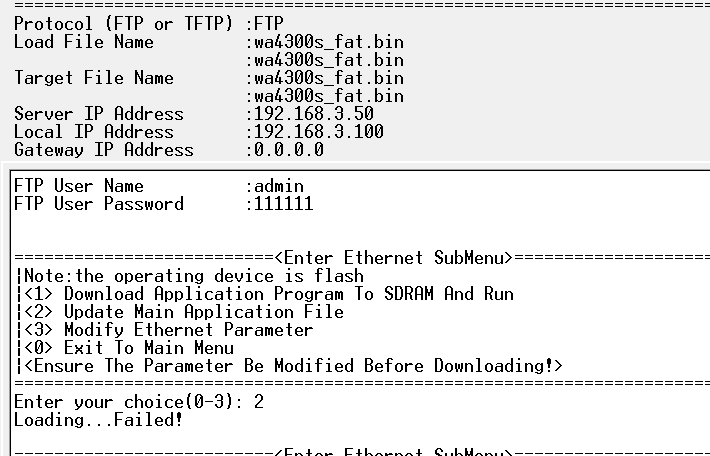 4.进入到Enter Ethernet SubMenu模式下,电脑ip 192.168.3.100 ping不通192.168.3.50