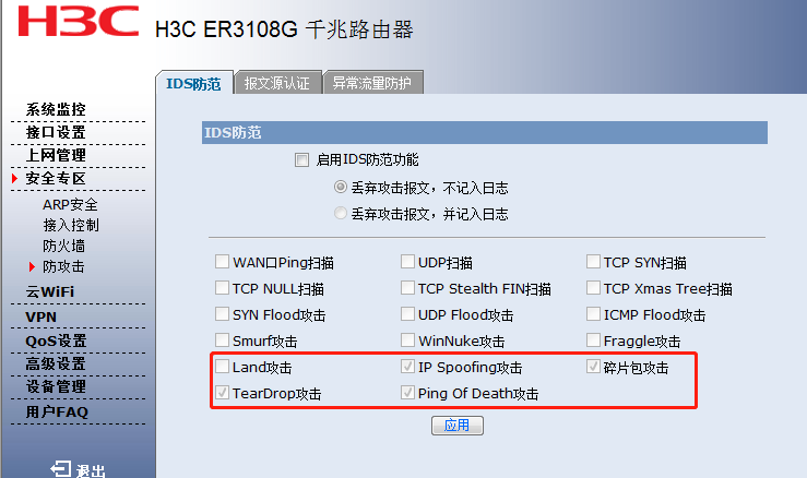 用管理员账号密码登录设备之后,进入安全专区,防攻击配置界面,发现有几个选项前面的对勾是灰色的无法取消,无法更改是什么问题?