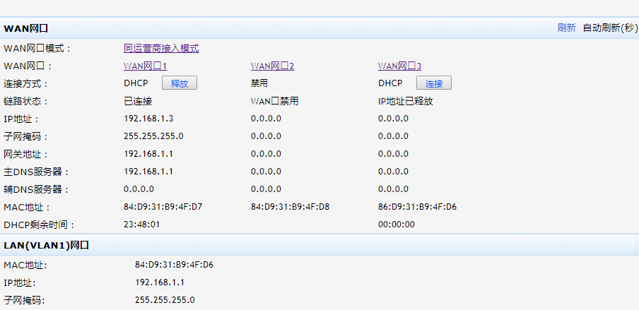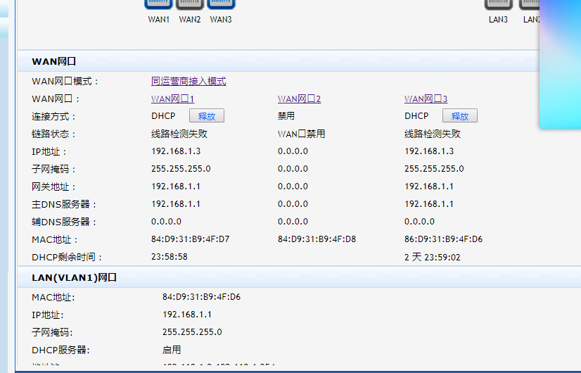这俩wan口获取的地址有问题啊,怎么都是192.168.1.3,怎么会被分配俩一样的ip地址呢,这样有冲突的