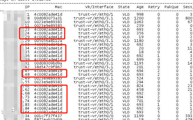 下图为防火墙上的ARP表,框出的IP地址为未启动的服务器的地址,对应的mac地址是和防火墙通过二层接口相连的ASA的接口mac。当尝试启动这些地址的设备的时候,提示IP地址被占用。