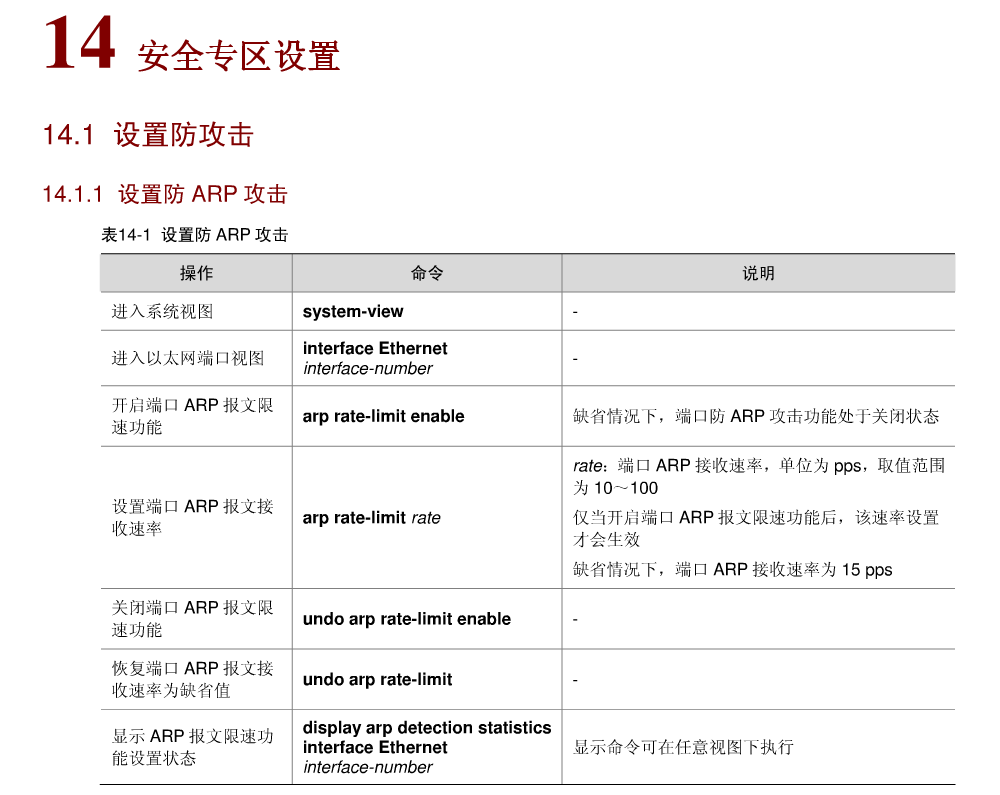 手册有说明:开启ARP限速后,如果端口通过的ARP报文超过了您设定的阈值,那么端口将会进入保护状态,并丢弃通过端口的所有ARP报文。在保护时间(5分钟)结束之后,端口会恢复ARP报文的转发
