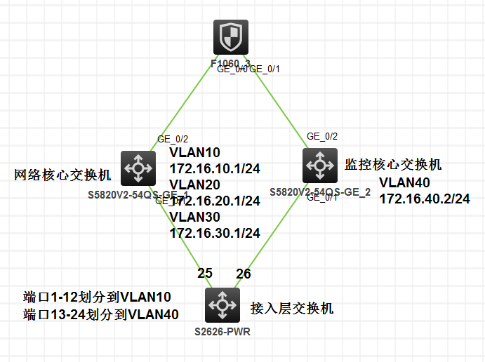 接入层交换机端口e1/0/1~e1/0/12划分到VLAN10,e1/0/13~e1/0/24划分到VLAN40,g1/0/25连接到网络核心交换机,g1/0/26连接到监控核心交换机,想要实现的目标是VLAN10的流量全部到网络核心交换机,VLAN40的流量全部到监控核心交换机。