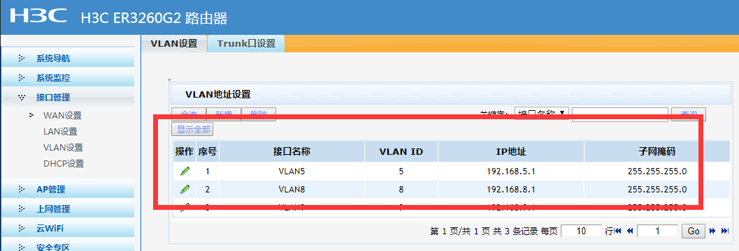 A点使用ER 3260G2系列路由器,进行双WAN口ppoe拨号上网,开通了NAT地址转换默认自动设置(内网划分多个VLAN:默认网关LAN:192.168.4.1,VLAN5:192.168.5.1)