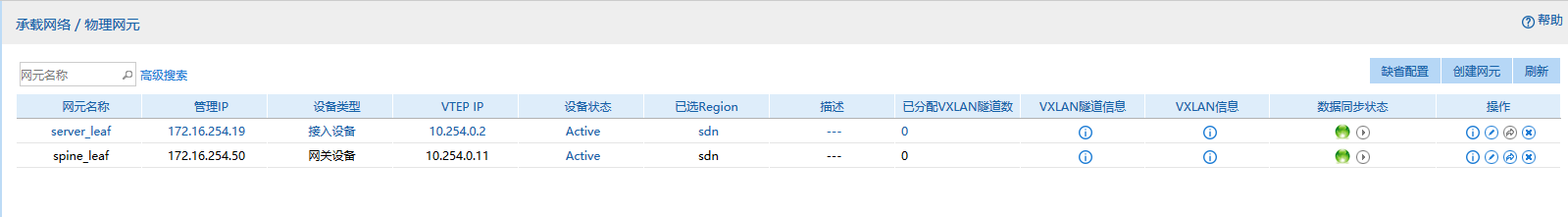 2. 在使用一台S5560后,VCF页面可以正常在“运维监控”--> "设备信息",以及“承载网络”--> "物理网元"中看到此设备且状态都是active的