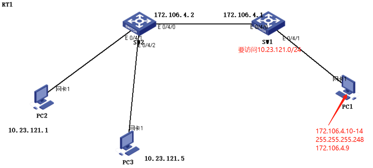 台式机网关是在SW2上面,172.106.4.0的网段网关是SW1上面,那个0.0.0.0这条路由其实指向的是一层交换机,画错了。SW1上面没做10.23.121.0/24 这条路由。不知道下一跳应该怎么写,