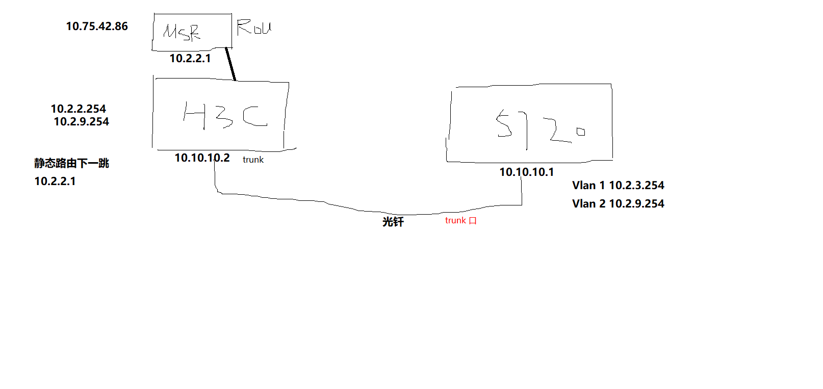 我有2台交换机1台H3C、1台华为S5720,我的需求两台设备上的某2段Vlan,需要互联,我在两台设备上划分了2个Vlan 10.10.10.1 30 、10.2.10.10.2 30 现在我两端Vlan 网段互访已经可以了,但是S3600上有一个出口路由,我现在在华为交换机上配置了一个静态路由 10.75.0.0 255.255.0.0 10.10.10.2 ,在H3C路由器写了2个华为的网段静态路由 10.2.3.0 255.255.255.0 10.2.2.254(下跳交换机) 10.2.9.0 255.255.255.0 10.2.2.254(下跳交换机)