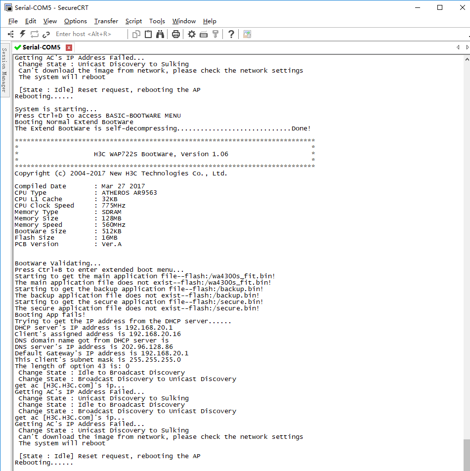 设置了“VLAN2”IP地址“192.168.222.1”子网掩码“255.255.255.0”,“trunk口设置”配置LAN1端口。另外,我发现WAP722S配置FIT AP后,用console连接之后就不断重启,在console中设回FAT AP,也一样不断重启,用WEB完全登录不上,网络连接也再重启一瞬间断开,请问这样正常么?网上说需要license,我没有,也不知道如何申请。