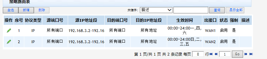 IP拨号是:动态地址(从DHCP服务器自动获取)我策略路由设置的是序号1:源IP地址段:192.168.3.2-192.168.3.254生效时间是00.00-24.00 周1 4 6 麦序2是:源IP地址段:192.168.3.2-192.168.3.254生效时间是00.00-24.00 wan1wan2周 2 3 5 接口出 都是点的强制.那为什么他有时候周1还在用wan2不应该用wan1吗。