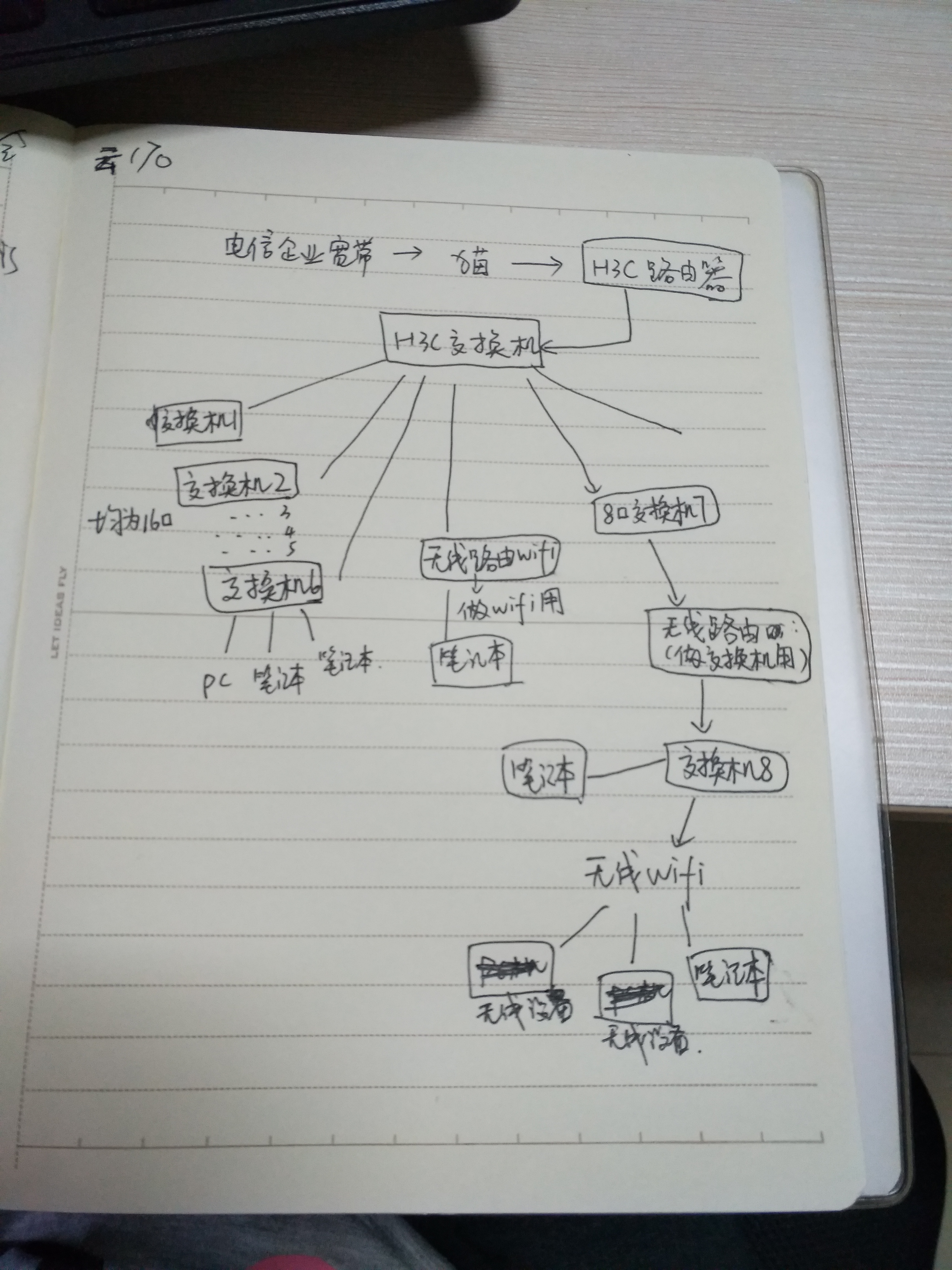 公司于2017年8月份采购的还H3c路由器,公司办的电信企业光纤50M,原来不足50人使用,都正常;目前公司已经扩展到150人以内了,发现每天都会出现断网情况,断网时重启路由器就会恢复!我们也找了电信工程师排查网络,他们没有查出问题,说一切正常。公司的组网情况参考我画的图。不知到是路由器软件要升级还是无法支持这么多人链接,