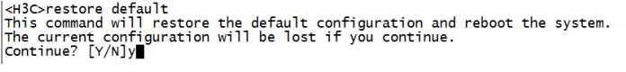<H3C>提示进入设备命令行,命令行下输入:restore default命令并回车,再次输入Y确认后,路由器将恢复到出厂设置并重新启动,同时账号密码也恢复到初始配置,初始账号密码均为小写的admin。