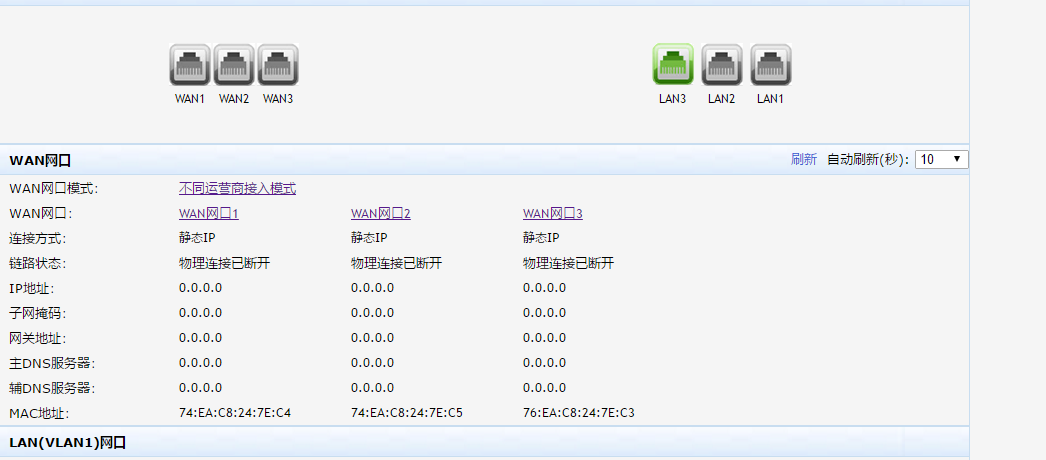 我使用该路由启用了3WAN口,在WAN口分别配置IP地址网关等,配置后,链接电脑配置相应网段地址,ping不同路由器配置地址,查看运行信息,发现运行信息中wan口信息都没有IP地址。