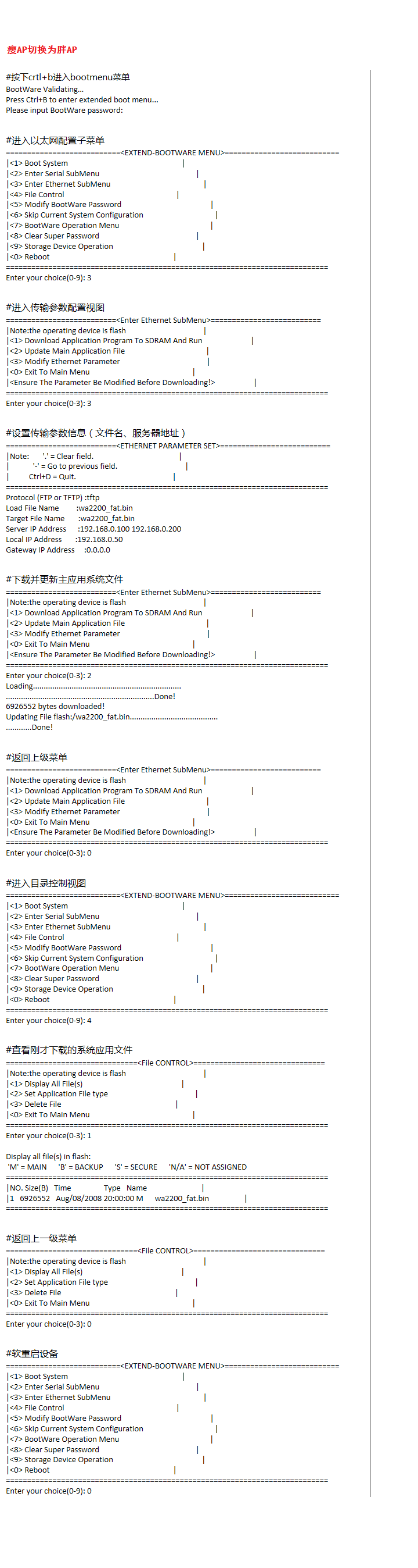 您好,瘦模式切换为胖模式无法直接通过命令实现,因为胖模式对于的系统包已经丢失了。您需要下载对应的胖AP版本,再结合3CD工具或标杆神器中的TFTP/FTP功能在Console接口登陆状态下进行还原操作。具体操作指导我把自己之前的笔记截图发您参考以下,3CD软件就需要您自己简单学习以下,很简单噢
