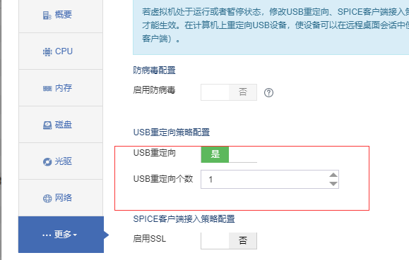 没有添加USB的功能,只有USB重定向策略配置