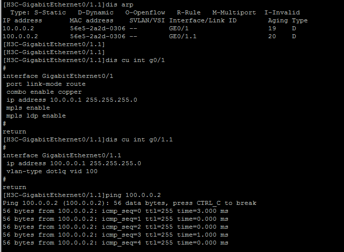 # interface GigabitEthernet0/0 port link-mode route ip address 10.17.247.118 255.255.255.252 ospf network-type p2p ospf bfd enable mpls enable mpls ldp enable # interface GigabitEthernet0/0.66 ip address 10.17.247.133 255.255.255.252 vlan-type dot1q vid 66 对端是134
