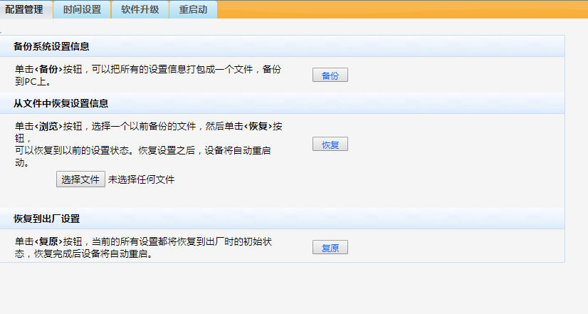 我们新买了一台H3C设备,原来的设备网关是192.168.2.1,新买的设备网关是192.168.1.1,把2.1的文件恢复到1.1上,提示文件错误。请问该怎么处理?