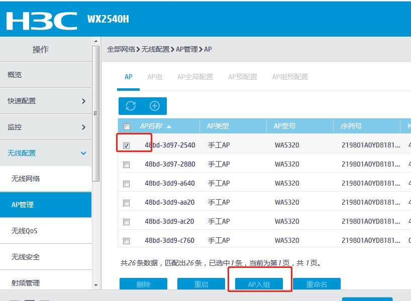 后配生效,在另一个AP组将ap添加进来,原来AP组就没有这个AP了。