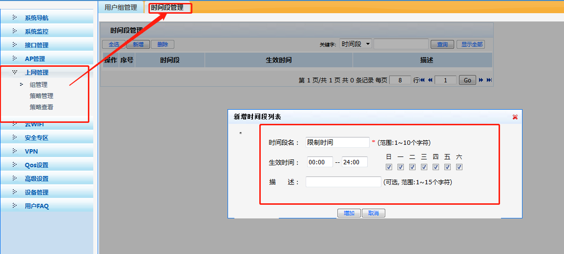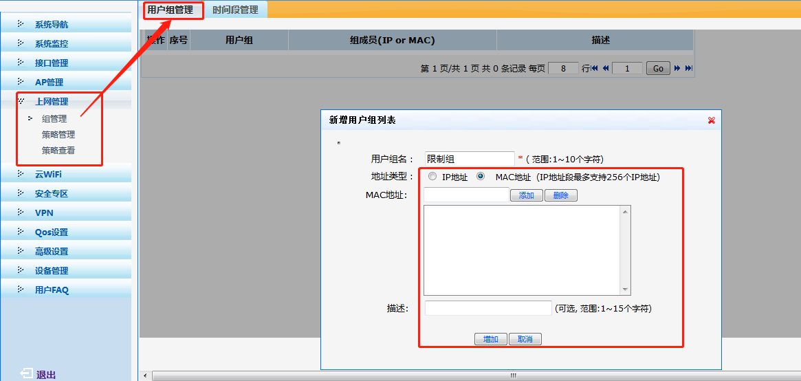 1、首先建立用户组,支持ip地址、mac地址,如下: