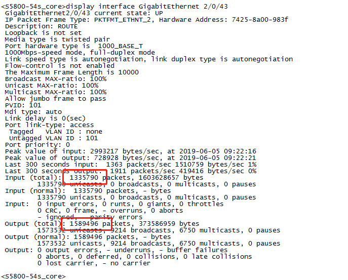 h3c S5800-54S 镜像转发丢包严重,被镜像口的出入包比监控口的出包少很多,是断开连接的情况下截图,不存在时差干扰。(10分钟差9w个包)