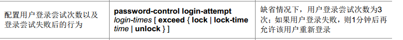 password-control login-attempt命令用来配置用户登录尝试次数以及登录尝试失败后的行为。undo password-control命令用来恢复缺省情况。