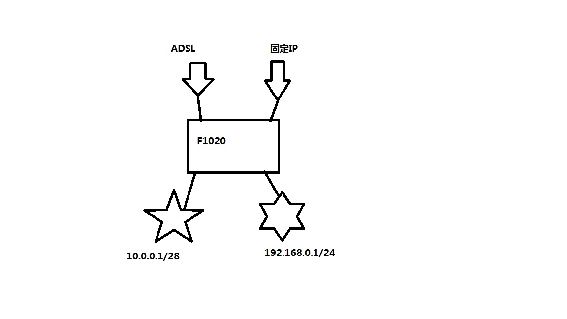 原来路由撤掉,用F1020 做路由, 划分两个VLAN vlan10 IP10.0.0.1/28 vlan20 IP 192.168.0.1/24 。 两个vlan 互通,vlan20启用DHCP服务 。