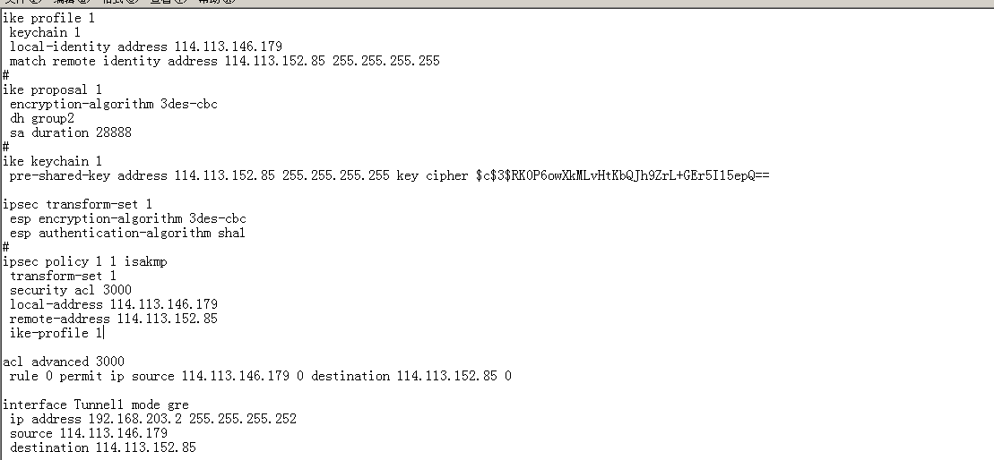 做GRE over IPSEC 具体配置如下 把公网地址换成客户给你的就好了 两端的设备配置都一样 就是把公网地址调换一下